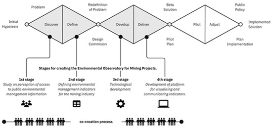 The Environmental Observatory for Mining Projects’ methodological design is based on the Public Innovation Lab’s triple diamond service design (2017) with the following phases: “discover”, “define”, “develop”, “deliver”, “pilot”, and “adjust” (see Figure 2). The service design recognizes five principles that are embedded in the development of a project: (i) user-centered, (ii) co-creative, (iii) sequencing, (iv) evidencing, and (v) holistic principles [82].