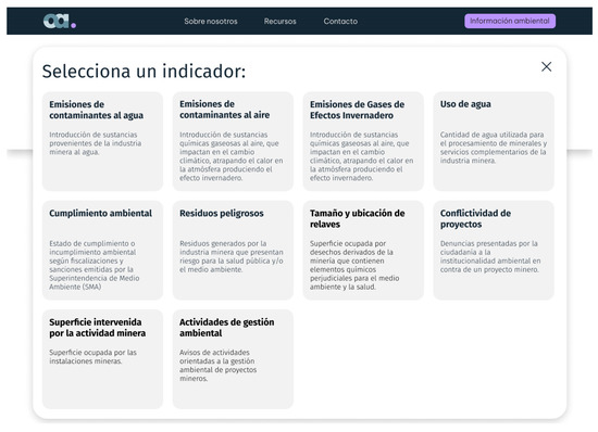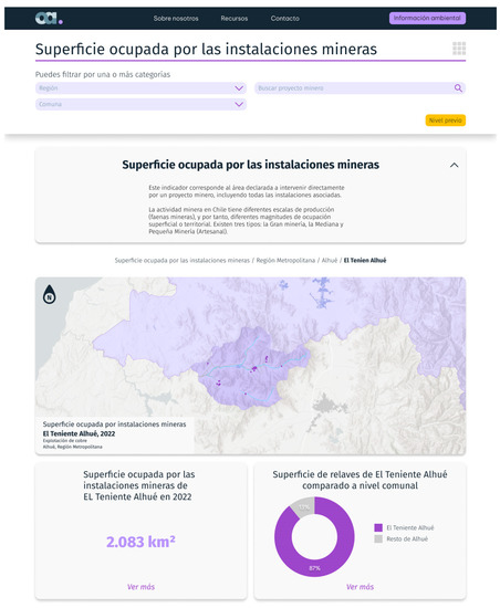 The Environmental Observatory of Mining Projects was developed in response to the gaps in access to and communication of environmental information in Chile and the need to build resilient communities in the face of climate change. It is a pilot information system focused on the mining industry, the most important economic sector in the country with an inherent environmental impact [15,16,17,18,19,20,21]. The Environmental Observatory for Mining Projects is in the prototype phase, and it is currently being implemented in four of the 346 municipalities in the country by integrating information from four public services: Ministry of the Environment, Environmental Assessment Service, Superintendence of the Environment, and the Second Environmental Court.