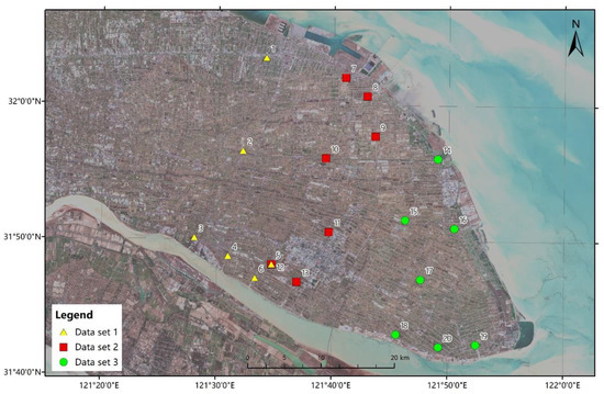 Qidong’s rivers are crisscrossed. Through a field investigation of the rivers in Qidong, we found that the rivers are mainly north–south oriented and are connected by a few east–west rivers. The different rivers in different sub-regions are polluted due to different reasons and show different optical characteristics. The relation between the water quality parameters (CODMn, NH3-N, TP, TN) and the spectral reflectivity is affected by the water environment. Before model building, it is necessary to divide different datasets according to the waterway orientation, assay values, and spectral values. As is shown in Figure 3, these rivers are divided into three classes. The sites in the figure indicate the water quality sampling site, and different colors indicate different sub-regions: west, middle, and east, corresponding to three datasets (see Figure 3), where dataset 1 (No. 1–6) represents the western sub-region, dataset 2 (No. 7–13) represents the middle sub-region, and dataset 3 (No. 14–20) represents the eastern sub-region.