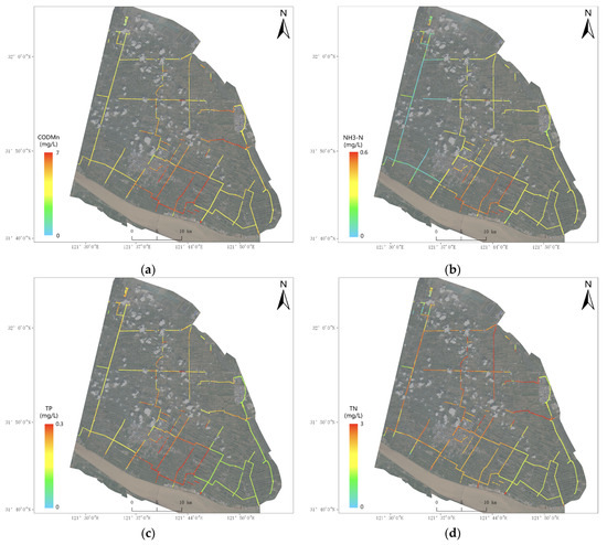 Inversion results in the survey region: (a) CODMn; (b) NH3-N; (c) TP; (d) TN.