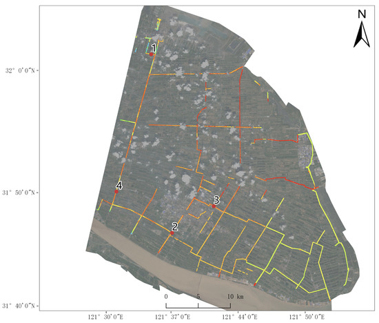 According to our inversion results, the main parameters influencing water quality in Qidong are TP, TN, and CODMn. Thus, the regions showing high pollution parameters were selected (the red color of the river means a higher pollution level). As shown in Figure 5 and Figure 6, the regions include the Daoan River, Touxing Port, Zhongyang River, Sanhe Port, etc.