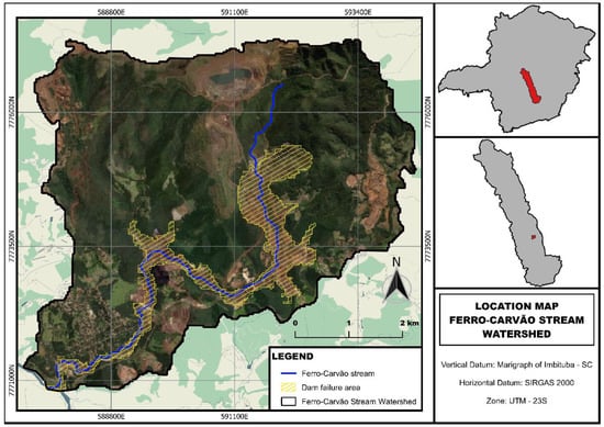 The study area is located in the Ferro-Carvão stream watershed, where the B1 tailings dam failed on 25 January 2019, in southeastern Minas Gerais state, Brazil, in the municipality of Brumadinho at 20°7′27″ S and 44°7′52″ W. With a size of approximately 33,270 km2 (Figure 1), the stream is an affluent of the Paraopeba River, which in turn is a tributary of the São Francisco River and one of the sources of Três Marias reservoir [59]. The dam failure released 11.7 mm3 of mine tailings, which flowed along the stream until reaching the Paraopeba River, 10 km downstream.