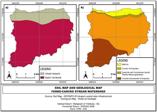 Soil map (a) and geology map (b) of the Ferro-Carvão stream watershed.
