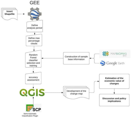 The framework adopted to diagnose the changes that occurred after the dam failure using Landsat 8, Sentinel 2A, and PlanetScope data involved seven stages (Figure 3) is described as follows. (a) Stage 1: The collection and pre-processing of orbital image data on GEE; (b) Stage2: The construction of training reference sample base information collected from Google Earth combined with MapBiomas corresponding to the space–time under analysis; (c) Stage 3: Random forest classifier selection and training on the GEE platform to provide the sampling signature of the classes; (d) Stage 4: An accuracy assessment of the classification processing method for the different spatial resolutions; (e) Stage 5: The development of the land use changes map; and (f) Stage 6: The estimation of the economic value of the changes.