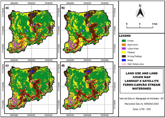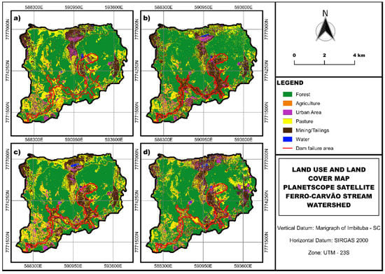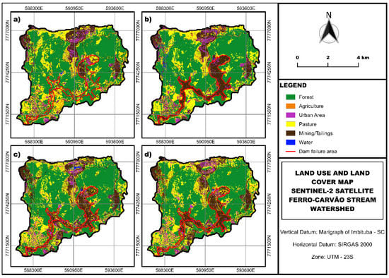 Land use and land cover map for (a) 2018 (before failure), (b) 2019 (after failure), (c) 2020, and (d) 2021, using the Sentinel-2 satellite.