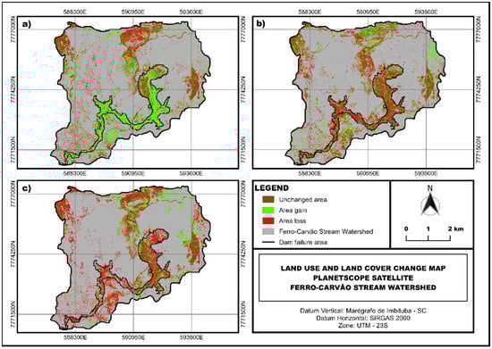By identifying LULC before and after the B1 dam failure, the aim was to determine the changes in the Ferro-Carvão stream watershed, especially in the failure zone. In order to diagnose changes, QGIS 3.16.10 with GRASS 7.8.5 was used with the semiautomatic classification plugin (SCP). The SCP uses the “Land Cover Change” tool, performs cross-tabulation in image post-processing, and diagnoses changes in land cover by creating a change matrix [83,84].