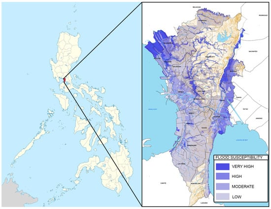 Metro Manila location and flood-susceptibility map (adapted from [69,70]).