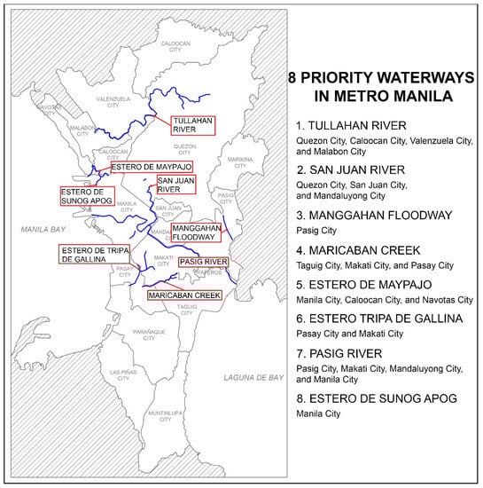 Waterways in Metro Manila identified as priority areas with the cities they cross (adapted from [74]).