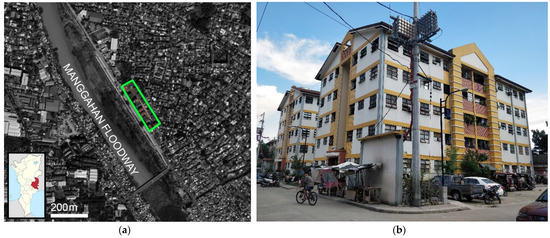 At the time of this study, the project had housed some 573 households. These households were resettled from the nearby east and west embankments of the floodway, which are severely vulnerable to floods (Figure 3). The project has a total of 15 planned buildings, of which only 10 have been completed. Each building has a total of five floors, with each floor containing 12 units. A community member is elected to serve as a representative for their building. The building representative is also supported by five leaders, each in charge of one floor. It is through this community structure that functions such as information dissemination and rule enforcement are enabled [80]. The Manggahan LRB community also has an established organizational structure with committees assigned to deal with issues and concerns within the resettlement project. A Disaster Risk Reduction (DRR) committee, for example, is tasked to facilitate DRR drills and training conducted in the community. These drills and training are provided by the local government as part of their DRR capacity-building mandate [63]. Due to the COVID-19 pandemic, however, these drills have been suspended.