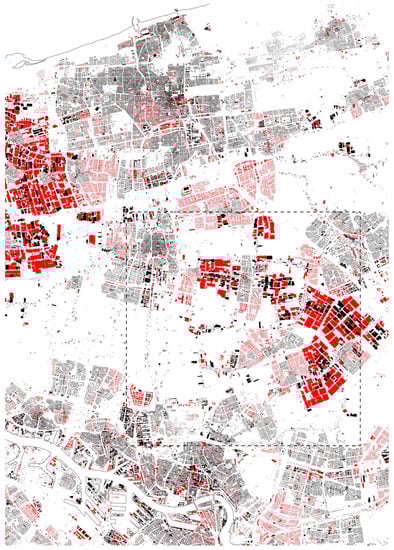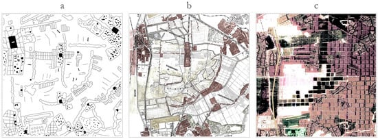 The Neutelings’ diagram is characterized by a reduction in the elements to those strictly related to the scale of the patches excluding the component of mobility and connections (Figure 4a (4)). The patches were articulated according to their morphology and differentiated by a characteristic pattern. They include the urban environments differentiated according to their different periods of construction and morphological configuration (historical centers, historical filaments, functionalist neighborhoods built in the first half of the 20th century, and cauliflower quarters built between the 1960s and 1980s; Figure 4a (3)). Patches also include some productive and agricultural areas (greenhouses, service, and commercial areas) as well as some specific parks and ecological areas (Figure 4a (2)).