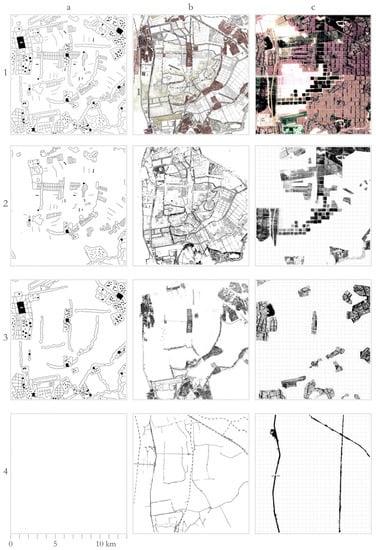 Analytical deconstruction of the three works: (a) patchwork metropolis; (b) urbanized landscape; (c) field metropolis. (1) Original picture; (2) unbuilt (natural and agricultural land); (3) urban; (4) infrastructures (author’s own, 2017).