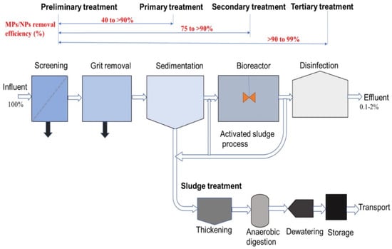 Figure 1 depicts a typical wastewater treatment plant (WWTP) system and the MPs/NPs elimination rates [7].