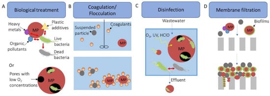 Figure 2 depicts the effect of MPs on various WWTP treatments, ultimately leading to reduced treatment efficiency [7].