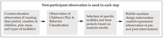 Although childhood offers important opportunities to establish active play habits, we do not understand developing and sustaining active play among children [40]. This is an exploratory study, and the authors observed and experimented with children’s play behaviors at the combined playground facilities in the children’s play area of Daan Forest Park. The interaction subjects and play behaviors of children aged 3–6 years during peer interaction were understood through observation. How play equipment can be designed to increase peer interactions was determined based on the observation results. In addition, the effects of pre-established versus new playground facilities on peer interaction were evaluated. Figure 1 shows the research steps of this study. In this study, we used non-participant observation, a well-validated method [41,42,43,44], because we wanted to observe children’s most natural behaviors.