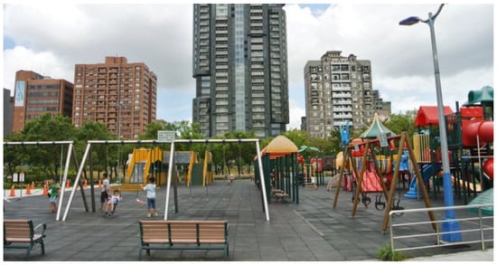 An outdoor playground is where users of all ages and different growth backgrounds can play. Senda [30] noted that a children’s play environment contains four elements—place, time, playmates, and activities. A rich play environment should provide its participants with sufficient time and space. Play equipment is essential for play, enticing children to enter and play unconsciously and freely. Several countries [16,17] have developed policies emphasizing children’s play’s importance. Senda [30] identifies a common sequence of behaviors in children’s use of play structures. At the first stage of functional play, children use the equipment as intended, for example, climbing up the steps and sitting to go down the slide. After some experience, children move on to a stage of technical play. Now enjoyment comes from exploring new ways of using the structure. Children begin using playground facilities to engage in play activities, such as hide, seek, and tag. Play facility provides an impetus to move on to another stage, social play.