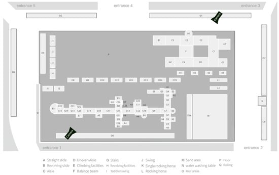 Non-participant observation was employed during the observation. Video recording commenced when a target group entered the play area and ceased when they left. A single caregiver–child group was recorded each time, and the behavior of 39 target groups (a caregiver with a child, a total of 78 individuals) in the play area was recorded. Multiple cameras could record the movements of the target group without them knowing it was being filmed. We looked at the behavior, and we did not include sound. Each group began when the target group entered the field and ended when they left the area. The observation was conducted between 2 and 4 p.m. on weekdays, when many people were in the play area. Since it was a non-participant observation, we conducted no interviews with the subjects. Therefore, we estimated the children’s heights based on their height compared to the playground entrance railings and used heights to correspond to probable ages. The reference for this information comes from the Taiwan Children’s Growth Curve provided by the Health Promotion Agency of the Ministry of Health [45]. The height of children aged 3–6 is 96–110 cm.