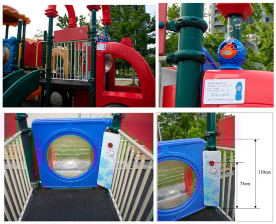 In the design, the priority was to create a difficult operation method, to cause children to spend some time familiarizing themselves with the facility, thereby creating opportunities for peer interaction. Operation methods and sudden events could trigger children’s attention and the imitation of others. A see-through design through which children could observe each other was selected for the wall to promote children’s level two behavior (parallel play with mutual regard). An enclosed space can cause children to produce multilevel play behaviors and encourage them to stay still for a short period, potentially triggering social play behaviors at level three or higher. Therefore, a space with a sense of enclosure was designed. The facility was created with entrances, exits, and easy access so children could choose whether to join or leave the play area. The designed play area featured H3 (revolving facilities) and enclosed spaces that provided places to stay for a short period. In the preceding observations, C9 (aisle of the slider set) was observed to be the location of the least peer interaction (0%) during children’s play. Since we found in our initial observation that some children will play near the play facility with portable bubble toys, it was clear that the behavior of blowing bubbles attracts the attention of children. Therefore, we decided to use a bubble machine as a design intervention. In the designed facility, a bubble machine with a red button was installed at C9, and activities at the location were recorded using a camera from a distance (Figure 4). The height of the partition boards in the facility was 95 cm, the minimum standard for the average height of children aged 3–7 years. This height was used as the basis for judging the age of children during observation; height surpassing one-third of the red partition board at its upper edge was used to indicate the observed children’s height range.