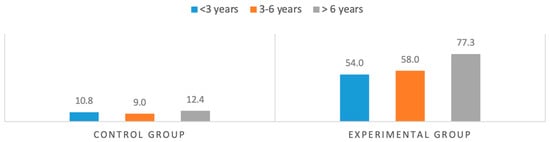 Based on their height, the observed children were divided into Groups A (<3 years), B (3–6 years), and C (>six years). The number of observed children in the experimental and control groups in the same timeframe was 264 and 56 (Table 5), respectively. The number of users after installation of the bubble machine was approximately five times that before this installation. The average use time per child before bubble machine installation was 10 s, which increased to 63 s after installation, indicating that the bubble machine activated the area. Considerable improvement was discovered in the use time of all three age groups (Figure 5).