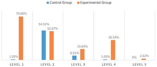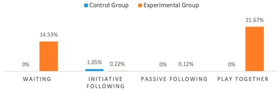 Level 1 behavior (simple parallel play) refers to children performing similar activities within 3 feet of each other without being aware of others’ presence. After installing the bubble machine, the number of users in the area increased, and numerous children often gathered there. Children were often too focused on operating the facilities. They did not realize that more and more children were gathering around them, leading to a drastic increase in the appropriate behavior. The percentage of level one behavior among the experimental group was 79.68%, higher than that for the control group (1.05%).