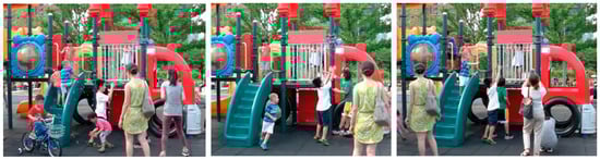 Group C children consisted of school-age children older than six who focused on group play in social development, with their caregivers gradually being replaced in status by their peers [49]; thus, caregiver–child interaction was infrequent during the two observations. When using the designed facility, Group C children exhibited less frequent peer interaction and spent more time in solo play. They tended to use the facility alone and even prevent other children from using it (Figure 8).