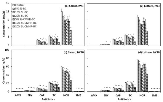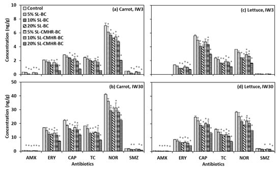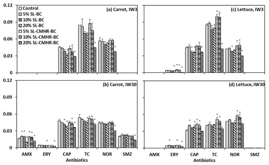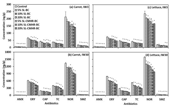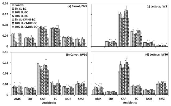 Regarding the effects of the different soil amendments, a consistent observation was that the 20% SL-CMHR-BC usually resulted in a significantly lower BCF for plant tissues as compared with the control soils. There were also some other noteworthy results. The BCFleaf/shoot of CAP for the carrots of the IW3 20% SL-BC soils was significantly lower than that of the control soils. The BCFleaf/shoot values of the AMX, ERY, CAP and TC for the carrots of the IW30 20% SL-BC soils were all significantly lower than those of the control soils. The BCFleaf/shoot values of TC and NOR for the lettuce were higher for the control soils compared with the IW3 5% and 10% SL-CMHR-BC soils. Similarly, the BCFleaf/shoot values of CAP, TC and NOR for the lettuce were higher for the control soils compared with those of the IW30 5% and 10% SL-CMHR-BC soils. Regarding the BCFroot, the 10% and 20% SL-BC both led to lower BCFroot values of AMX and SMZ for the carrots of the IW3 soils compared with the control soils. The IW30 10% and 20% SL-BC soils, in general, led to significantly lower BCFroot values of CAP, AMX and NOR for the carrot, while the IW3 10% and 20% SL-BC soils led to lower BCFroot values of ERY, TC and NOR for the lettuce. For the IW30 soils, higher BCFroot values of AMX and CAP were found for both crops of soils with the 5% and 10% soil amendments, except for CAP in the 10% SL-BC soils.