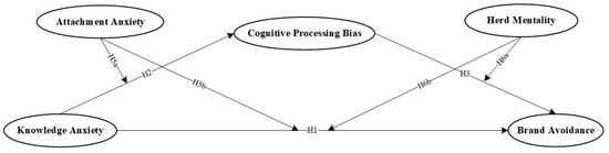 The study of Lazarus scholars’ stress-based cognitive appraisal theory (CAT) highlights that individuals with a pre-existing negative bias in their appraisal processes and who are unable to change their harmful or threatening conditions tend to adopt emotion-focused coping styles, such as avoidance and distancing, for psychological protection [42]. Recent research has also shown that external stimuli such as knowledge overload during the COVID-19 pandemic can affect people’s internal states (e.g., anxiety) and their subsequent processing behaviors [49,50]. The processing of information sources in CAT can explain how emotionally-relevant information is transferred through various means such as social media, online articles, forums, and news sites, and how positive or negative information content may trigger more attentional aspects of cognitive engagement [63,64,65]. As a direct consequence of this, users’ feedback, engagement, and social sharing behaviors may differ. The purpose of this research is to examine whether cognitive processing biases mediate the relationship between knowledge anxiety and brand avoidance. Therefore, the preceding research provides a rationale for investigating the mediating effects, as follows: