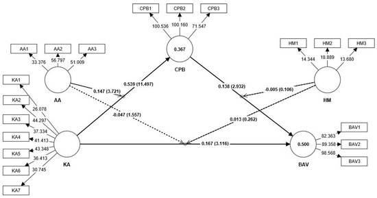 The inner variance inflation factor (VIF) values for all combinations of constructs are below the threshold of 3, whereas the outer VIF values of all indicators are under the threshold of 5. Therefore, collinearity among the predictor constructs is not a critical issue in the structural model [91]. After looking at the measurement model, a structural model was built using a method called “boot-strapping” (5000 subsamples). In Table 4, one can see the results of the testing of the research hypotheses. For CPB, the R2 value of the latent variables is 0.367, and for BAV, it is 0.5. In this study, t-values and p-values were used to decide whether or not the hypotheses were true [91]. In Table 4, we present the standardized path coefficients. The significance of each effect is assessed with the bootstrapped confidence intervals; if 0 is not included in the confidence interval, the path coefficient is significant at the 0.05 significance level [90].