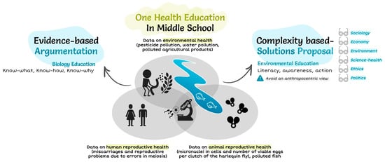 Schooling should equip citizens with the scientific knowledge necessary to make informed decisions about health problems arising from the current environmental crisis. Given the scarcity of educational proposals that integrate evidence-based argumentation, One Health education and complexity-based solution proposals, this study aims to introduce a scenario linking the use of pesticides in agriculture to infertility, and to analyse the extent to which it promotes students to apply these three approaches. The activity requires 10th graders to rank 6 cities from most to least polluted, using evidence on the reproductive problems of different organisms in the ecosystem (humans, harlequin flies). Moreover, students have to propose solutions to avoid the toxic risk caused by pesticides. Group discussions are analysed to determine learners’ performance in using evidence and formulating causal explanations to justify their rankings, as well as in proposing reasoned solutions, considering different perspectives. The results show that most groups rank cities as expected. Although they do not use all available evidence, the design of the activity encourages students to establish frequent causal relationships between human, animal, and environmental health data (argumentation integrating the One Health approach). Moreover, most solutions are palliative rather than preventive, respond to an anthropocentric interest, and their consequences are rarely assessed. In doing so, students only foresee their environmental or economic impact, but not their ethical or political consequences. Educational implications are discussed.
