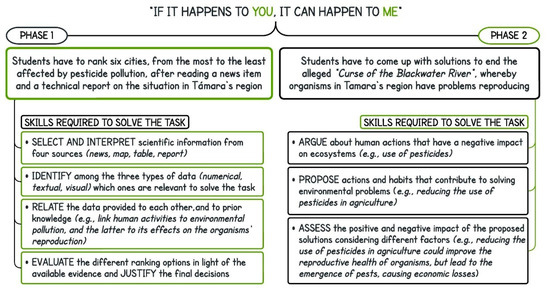 However, in the present study (third activity of the sequence), which relates pesticide exposure to alterations in meiosis (reproductive problems), learners receive information expressed in different semiotic modalities (visual, numerical, textual) and from different sources (map, news, report) which they must interpret and relate to each other. It should be noted that each semiotic modality provides different but complementary information. Therefore, all data must be interpreted as a whole. In order to draw valid conclusions, the most important skills are to identify the relevant data and establish functional causal relationships between them. During the intervention, concepts that are rarely mentioned in 10th grade science classrooms (e.g., toxicology, micronuclei) are introduced to check if students can connect them to their prior knowledge. The intervention lasts fifty minutes and is divided into two phases (Figure 2).