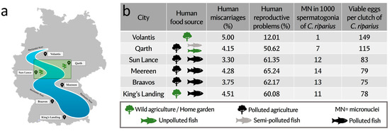 (a) Map of the region of Támara with farmland in a rectangle; (b) table of data on food sources and reproductive health of humans and harlequin flies (Chironomus riparius) in the six cities.