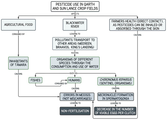 To reach this conclusion, students should relate and synthesise as much information as possible (Supplemental Material, Table S1). Thus, they must first associate the pesticide use (general cause) with the development of reproductive problems (general effect). They should then relate the specific causes (e.g., food sources) to the differences observed between cities in terms of effects at the cellular level (e.g., errors in meiosis) (Figure 3b). Moreover, students must distinguish which data relate to humans (e.g., miscarriages) and which to harlequin flies (e.g., viable eggs per clutch) in order to relate the reproductive health of the two species (Figure 4). Furthermore, to train students to distinguish relevant from irrelevant information, and to emphasise the importance of considering all available data together, a numerical distractor is included in the table: miscarriage rates—but the text of the report specifies that “there are no significant differences between cities”.
