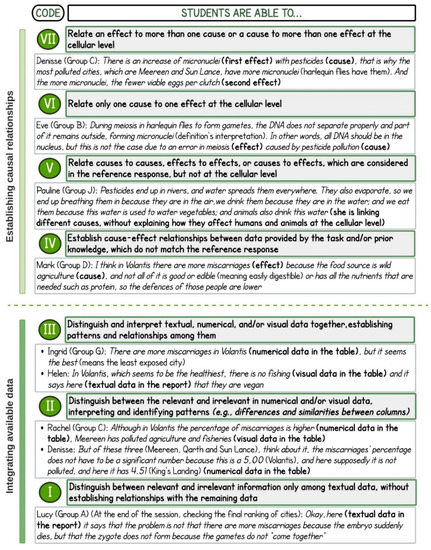 Finally, groups G and I are a good example to show that the level of performance is not determined by the conclusion drawn (ranking of cities), but by the underlying reasoning expressed by the students, as both groups rank cities correctly, but their performances are very different. The discourse of group G is dominated by situations in which students relate data (9/10 codes). Five of them match the reference response (codes VI–VII). At the end of the session, they manage to relate several causes (pesticide use, proximity of cities to farmland, transport of pollutants by river) to the formation of micronuclei in harlequin flies (cellular effect) (code VII). In contrast, group I starts by relating pollution (cause) to the occurrence of malformations or the transmission of viruses (HIV) and parasites (Anisakis) (code IV). After reading the report, they rank the cities based solely on food sources and the percentage of reproductive problems in humans (code III), since learners, for the sake of simplicity, tend to use evidence in isolation rather than linking data [44].