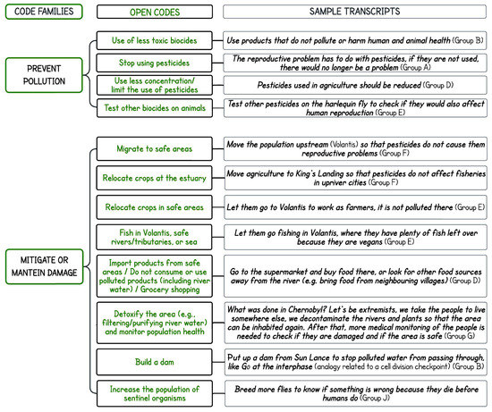 Considering the environmental perspective, Hans (Group B) proposes relocating crops near the estuary to reduce damage, but pollutants dilution in the sea is not the solution [51]. George agrees with Hans: “Right, so the water in upstream cities would be pesticide-free”. However, Eve realises that Hans’ proposal would only displace the problem by affecting others: “If you do that, instead of polluting the river, you pollute the sea. That is fine for you because you eat healthy, but you still pollute”. Alex (Group E) reflects similarly when assessing Gunter’s proposal to move crops to Volantis: “Although Volantis is not polluted now, if pesticides are used there, it will be”. In group H, when Nico rejects the idea of stop using pesticides because it would lead to the emergence of bugs (“Nobody wants to eat bugs”), Nelly defends the need for bugs (“They are natural and must be there”). Nico prioritises his own interests, showing an anthropocentric perspective (nature at the service of humans, to the detriment of the biocentric view), which is a widespread attitude among students [52].