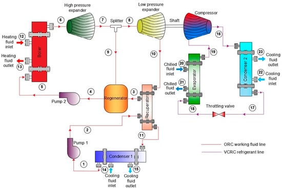 The thermodynamic analysis of the dual-fluid ORC-VCRC described is made theoretically in the previous study []. To perform the thermodynamic analysis of the ORC-VCRC configuration, the following simplifications and approximations are made: