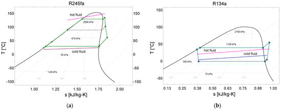 The temperature-specific entropy (T-s) diagrams of the dual-pressure ORC and VCRC are presented in Figure 2.