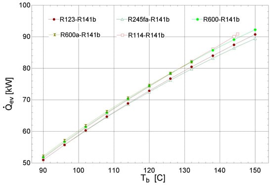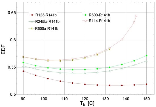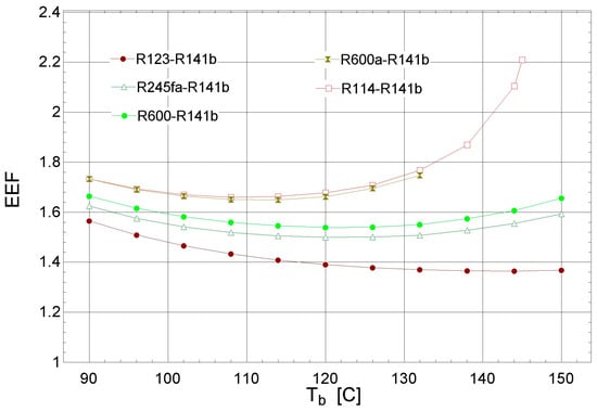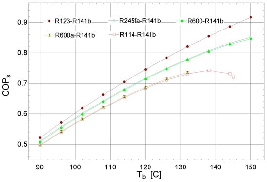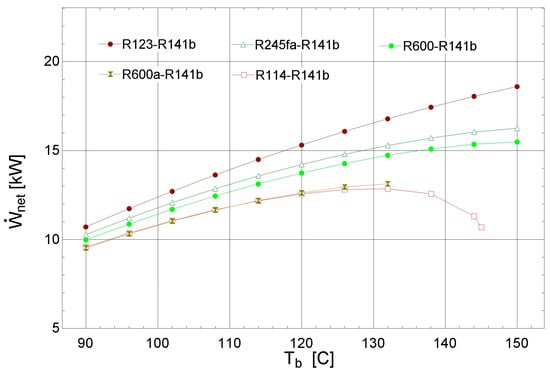 The thermophysical and environmental properties of the analyzed fluids in the combined system are given in Table 2. These selected fluids are among the most used in both separate ORC and VCRC systems and combined ORC-VCRC power plants [,,]. In the analysis, the working fluids used in the ORC system are R114, R123, R600, R600a, and R245fa. In the subsystem VCRC, R141b, R600a, R290, R134a, R123, R245fa and R143a are applied as a refrigerant.