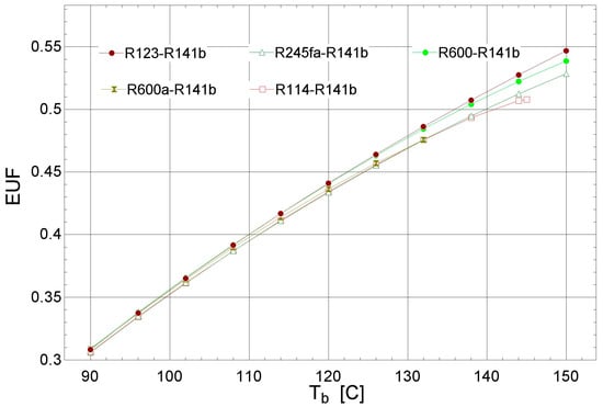 The simulations are performed by considering the operating conditions given in Table 1. In the analysis, the working fluids used in the ORC system are R114, R123, R600, R600a, and R245fa. In the subsystem VCRC, R141b, R600a, R290, R134a, R123, R245fa and R143a are applied as a refrigerant. Calculations for the proposed combined system to compare the performance parameters are realized for the thirty-five fluid pair combinations under the same operating conditions. The simulation results are presented in Table 8. The evaluation parameters in the thermodynamic analysis are as follows: the overall system coefficient of performance (), exergy efficiency (), energy utilization factor (), net power (), total exergy destruction rate (), evaporator heat rate (), the mass flow rate of the working fluid in the ORC () and the mass flow rate of refrigerant in the VCRC ().