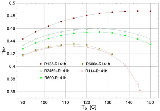 The maximum exergy efficiency of the combined system is calculated as 48.53% for the R123-R141b combination. In addition, as can be seen from Table 8, the highest exergy efficiency values are observed by using R123 fluid in the ORC sub system.