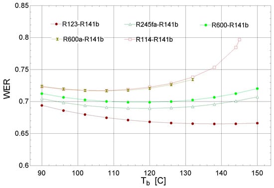 Waste exergy ratio () of the combined system can be expressed as the ratio of the total waste exergy to the total inlet exergy, and WER can be calculated by Equation (15).