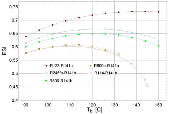 It is seen that the minimum waste exergy ratio () values are obtained by using R123 fluid in the ORC system. In other words, it is the R123 fluid that makes more use of the exergy of the hot fluid. Similarly, the minimum exergy destruction factor () values are obtained by using R123 fluid in the power cycle. The lowest value is calculated as 0.517 for the R123 ORC-R141b VCRC fluid couple. A higher sustainability index means a lower environmental impact factor. Accordingly, when Table 10 is examined, the lowest and, therefore, the highest ESI values are obtained using R123 fluid in the power cycle. The minimum and maximum belong to the R123-R141b fluid pair.
