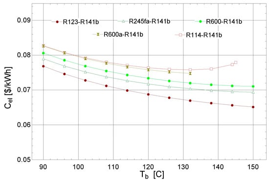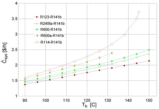 Meanwhile, the exergoeconomic analysis results are given in the last three columns of Table 10. The best results of the , , and values are obtained for fluid combinations formed by using R123 in the ORC system. The lowest total system cost was calculated as 1767 $/h for the R123 ORC-R123 VCRC fluid pair. The minimum value of the unit cost of electricity produced by the combined system, 0.0664 $/kWh, was obtained for the R123 ORC-R290 VCRC. The fluid combination that allows the combined system to pay for itself in the shortest time () was R123 ORC-R290 VCRC.