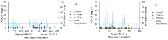Nitrate concentration (mg L−1) in SO for (A) leachate and (B) runoff samples in the 2014/2015 and 2015/2016 seasons; (C) leachate and (D) runoff samples in JA 2015/2016 season. cmax is the maximum acceptable concentration of NO3-N according to CONAMA [45].