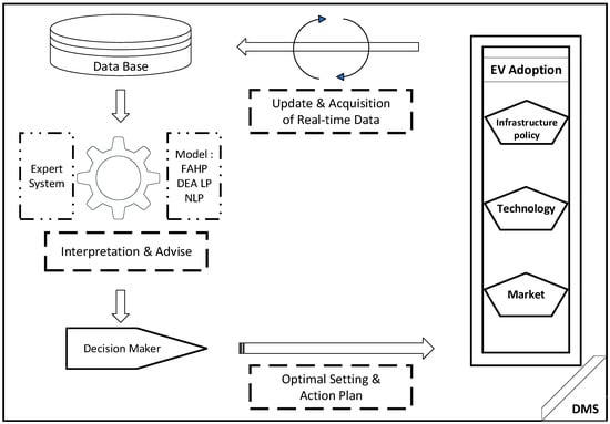 In response to the requirement to address the global climate crisis in urban areas caused by the logistics sector, an increasing number of governments around the world have begun aggressive strategic actions to encourage manufacturers and consumers to adopt electric vehicle (EV) technology. One of the most beneficial aspects of driving an EV is that it reduces pollution while also reducing the use of fossil fuels, as well as improving public health by improving local air quality. Nevertheless, the level of EV adoption differs significantly across markets and geographies. EV adoption barriers slow the overall rate of electric mobility. This study ranks a list of obstacles and sub-hindrances to the adoption of electric vehicles in Thailand using the Fuzzy Analytical Hierarchy Process (FAHP), a Multi-Criteria Decision Making (MCDM) technique. The results showed that infrastructure policy barrier (A), which had the highest weight of 0.6058, was the biggest barrier to EV adoption, followed by technological barrier (B) with a weight of 0.2657, and then by market barrier with a weight of 0.1285. Insufficient charging infrastructure network (A3), lack of proper government support/incentives and collaboration (A1), insufficient electric power supply (A2), high capital cost (C3), and EV charging time (B3) were key sub-barriers to EV adoption in Thailand. Decision Making Systems (DMS) have additionally been created to assist executives in making decisions about the aforementioned barriers. The DMS is based on the concept of computer-aided decision making in that it allows for direct user interaction, analysis, and the ability to change circumstances and the decision-making process based on the executives’ own experience and abilities. Thus, the findings of this study aid in the formulation of market strategies for relevant stakeholders and shed light on potential policy responses.