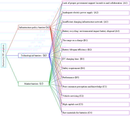 Various governments are setting specific targets to encourage EV adoption in their countries in order to reduce GHG emissions that cause climate change. Regardless of the advantages of electric vehicles, numerous difficulties and limitations must be countered in order to be fully implemented. Previous research had been conducted to investigate the potential barriers to its adoption. According to relevant literature, barriers can be classified into several categories. For example, Zubaryeva et al. [31] divided EV adoption barriers into demographic criteria, environmental criteria, energy criteria, and transportation criteria. Some classified these impediments into three categories: infrastructure, financial, and technological obstacles [11,12,32]. These barriers were classified in this paper as infrastructure policy, technological, and market barriers. The following are the specifics: