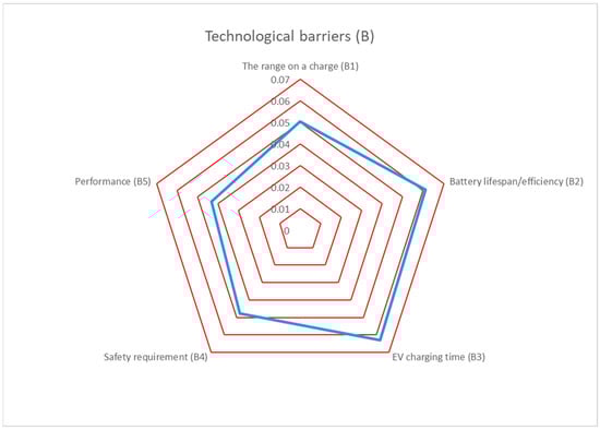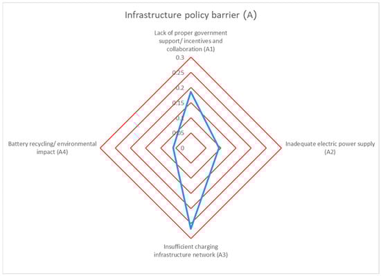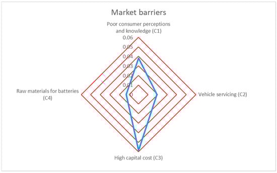 The final weight of those barriers was obtained and normalized weight vectors were finally acquired following Chang’s extent analysis method on FAHP. Table 7 demonstrates the final weight of importance for each of these main and sub-barriers. Figure 6, Figure 7 and Figure 8 show radar charts of the sub-barrier weights of infrastructure policy, technological barriers, and market barriers.