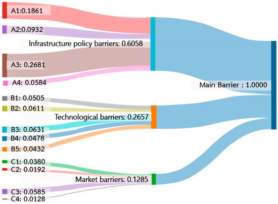 Sankey diagram illustrating the relationship between the FAHP categories “main barrier” and “sub-barrier”.