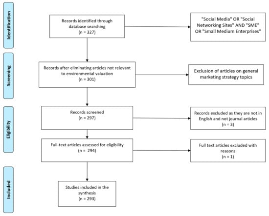 The researchers conducted a bibliometric literature search using Scopus, a popular database with a comprehensive view of global research output and a powerful search engine. After selecting keywords, creating search strings, and building a database, we performed a keyword search for “Social Media” OR “Social Networking Sites” AND “SME” OR “Small Medium Enterprises”, which resulted in the retrieval of 327 papers from Scopus. The data collection was conducted in January 2023. (Since Scopus is constantly updated, the results may change over time). We then reviewed the titles and abstracts of the papers to ensure that they were relevant to our research subjects, SMEs, and social media, trimming them down to 301 articles. An additional four papers were excluded for two reasons: (i) they discuss marketing strategies for SMEs without explicitly addressing social media, or (ii) they examine the economic impact of social media on communities but not on SMEs. This left us with 297 documents, which were then narrowed down to journal articles, conference papers, book reviews, and English-language publications, resulting in additional four papers being removed. We reviewed the remaining articles to confirm their relevance and removed any that did not specifically address social media in relation to SMEs. This resulted in a final selection of 293 research publications, which were then analyzed using bibliometric methods (as shown in Figure 1).
