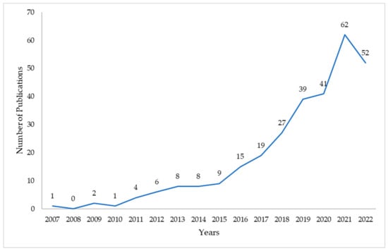 After conducting a Scopus-based performance analysis of the existing literature on SMEs and social media, we compiled a knowledge base of 293 documents, including 253 journal articles, 19 conference papers, 15 literature reviews, 5 books, and 1 conference review. The literature is recent, appearing slowly in 2007, rapidly increasing in 2015, and reaching a peak of 62 publications in 2021 (Figure 2). Our findings on the rapid increase in literature on SMEs and social media from 2015 to 2021 align with the observation made by Alalwan [15] and Qalati [16], who also reported an increasing trend in publications related to this topic. This supports the growing significance of social media in the SME sector. The review of the literature published over the past one and a half decades highlights an exponential growth in research on the relationship between SMEs and social media. This could be a result of the growing integration of social media into everyday life and the widespread use of mobile devices, which have had a significant impact on human behavior globally (cf., [15,16]). This is also confirmed by [48], who state that the accessibility of cost-effective internet connections and the widespread availability of smartphones compatible with social networking apps are crucial factors. These essential technological and financial drivers enable both direct and indirect network externalities, which help overcome critical adoption obstacles and influence users’ choices.