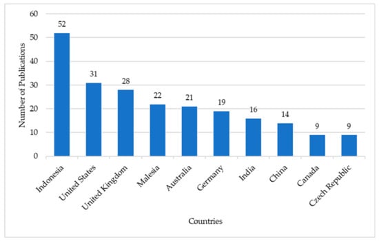 The distribution of the scholarly publications on SMEs and social media by country is presented in Figure 3. The data show that the most productive countries in terms of publications are Indonesia (92), the United States (31), and the United Kingdom (28), which together account for 51% of all the publications examined in this bibliometric analysis. Anglo-American countries are a significant contributor to the research on SMEs and social media, while there is also significant interest in the topics among Asian countries, particularly in Indonesia, Malaysia, India, and China. Indonesia, Malaysia, and India have recently experienced significant growth in Internet and social media usage. China has extensively used social networking sites for both political activism and commercial purposes.