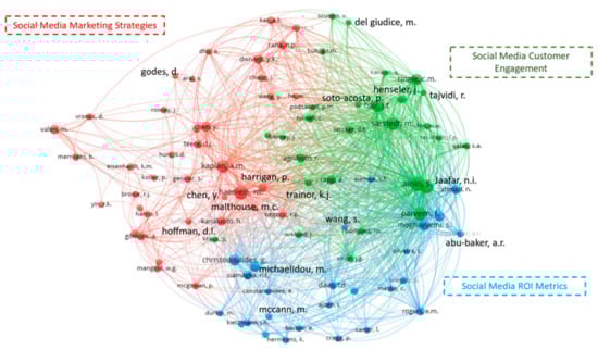 Figure 4 illustrates the relationships between frequently co-cited authors within the literature on SMEs and social media. The science co-citation map suggests that authors who are frequently cited together share similar thoughts [53]. The nodes in the map represent individual scholars, and the connections between nodes indicate intellectual similarity. The size of the nodes reflects the number of co-citations received by each author, with larger nodes representing more co-citations. Adjacent nodes are considered to have similar intellectual content. The co-citation map can be grouped into three clusters: (i) social media customer engagement, (ii) social media ROI metrics, and (iii) social media marketing strategies.